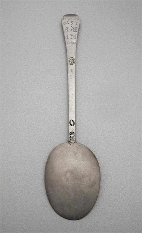 A Charles II spoon, with a stylised tulip head, pricked 'N.F, R.F 1670', maker unascribed (a fleur de lys in a pelleted circle struck thrice and once with a device), probably Wiltshire/Somerset, c.1670, 7.7in (19.5cm).