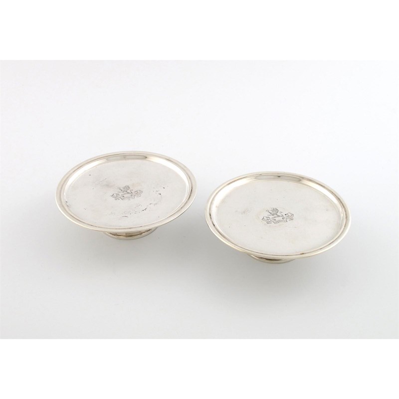 circular form, on a raised plain circular foot, diameter 12.8cm, approx. weight 9.5oz. (2)