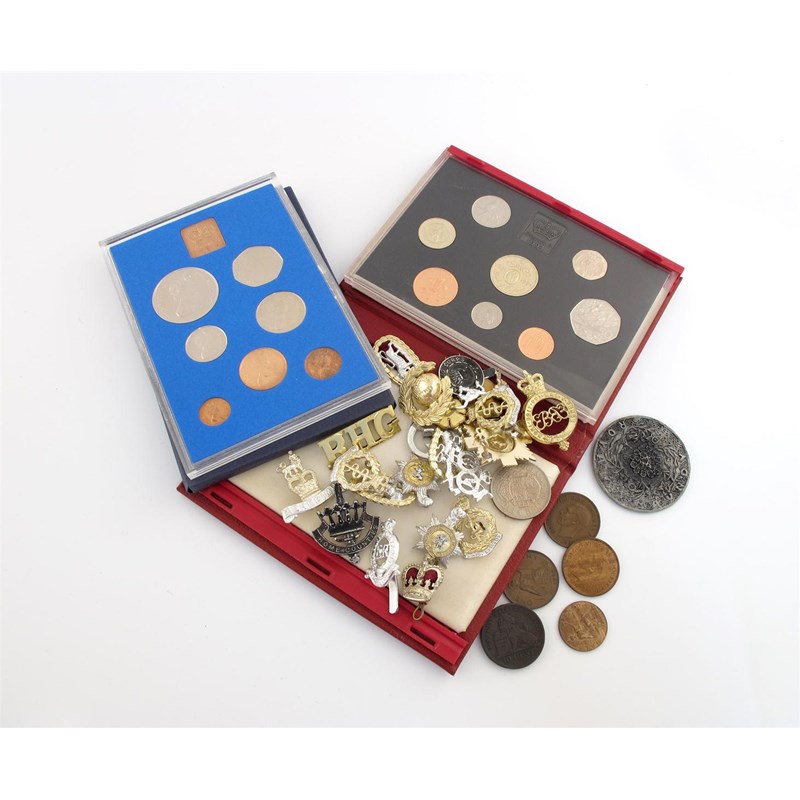 Elizabeth II, "Britannia" silver proof collection, 1997, £2 - 20p, in case; Proof old and new size 5-Pence, 1990, in case; Year sets 1972 (2), 1994, proofs and uncirculated coins mint state; other Crowns (9), 1935 - 1965; and sundry modern coinage, badges, etc., these varied state. (qty)