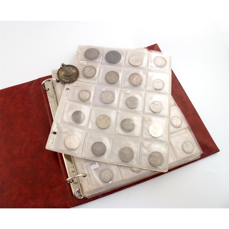 Germany, a collector's album, containing silver coinage, including Prussia, Wilhelm II, 5-Marks (2), 3-Marks (5), 2-Marks and later Third Reich Hindenburg issues, etc; together with base metal issues, nearly filling 11 pages; and a silver portrait medal of Leopold II of Belgium, 1902, the 600th anniversary of the Battle of Coutrai, 50mm, suspension loop and ring. Varied state. (qty)