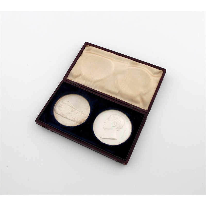 The "Telford Medal" of the Institute of Civil Engineers, frosted and glazed silver clichés of the obverse and reverse, 1828, by William Wyon, head of Telford to left, rev the Menai suspension bridge each 56mm (BHM 1328), contained in a presentation maroon leather fitted case. Obverse cliché mint state, the reverse with some marks under the glass, very rare.