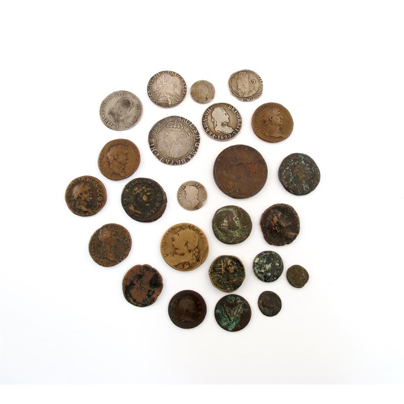 Charles I, Shilling, Tower mint, Group D, mm portcullis, 1633-34 (S 2789), fine; and Sixpence, cut and worn; George III, Shilling 1787, very fine; Spain, Ferdinand VII, 2-Reales, 1811, 1820; other coins, silver, copper and bronze, Ancient world, others, varied state, except as stated. (qty)
