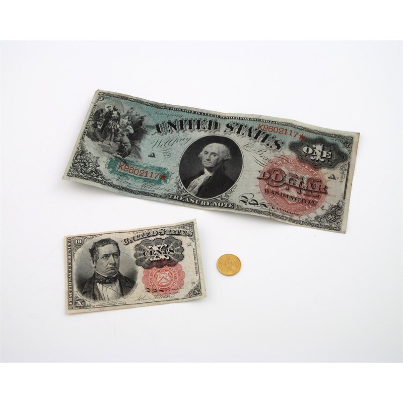 U.S.A., Gold Dollar, 1874, Indian Princess (Fr 94), good very fine, U.S.A., Banknotes (2), Treasury, Act of March 3rd 1863, issued 1869, 'Washington' Dollar (Pick 144; Koike 13); Meredith 10-Cents, 5th Issue, Series of 1874 (Pick 122), both good fine though have been folded. (3)