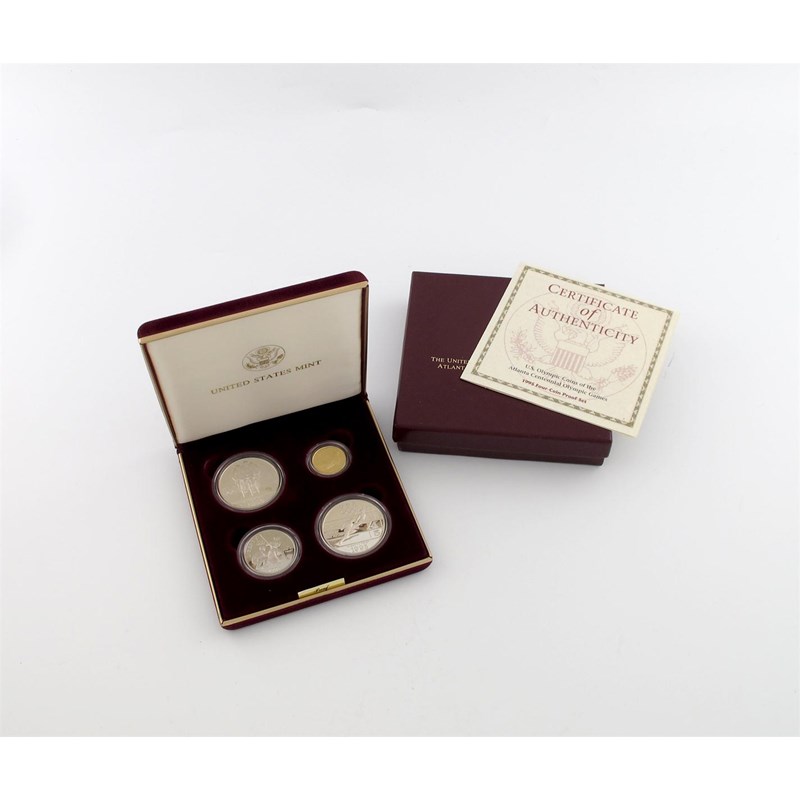 U.S.A., Atlanta Centennial Olympic Games, proof set of coins, 1995, Gold Five-Dollars, Silver Dollars (2) and 50-Cents, in case of issue. Brilliant mint state.