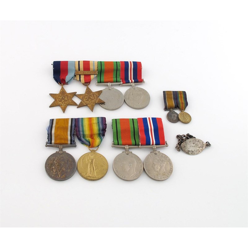 Word War I pair, War and Victory medals (2. Lieut M. O. Barclay), with miniatures and identity tag, "Lt. M. O. Barclay"; WW II, group of four medals, 1939-45 and Africa stars, later with clasp 1st Army; Defence and War medals. Very fine. (7)