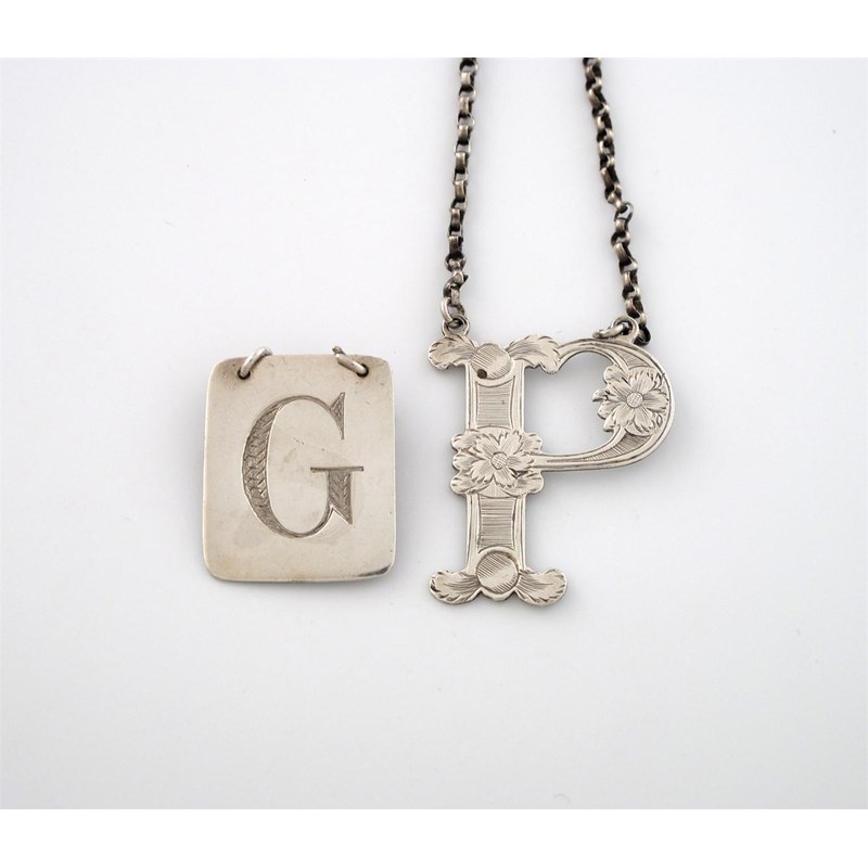 rectangular form, incised 'G', plus a Scottish silver cut-out letter 'P' wine label, by William Cunningham, engraved decoration. (2)