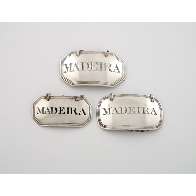 comprising: one of rectangular form, reeded border, pierced 'MADEIRA', by Rawlings and Summers, one of similar form, incised 'MADEIRA', London 1818 and a William IV 'MADEIRA' label, by Joseph Willmore, Birmingham 1831. (3)