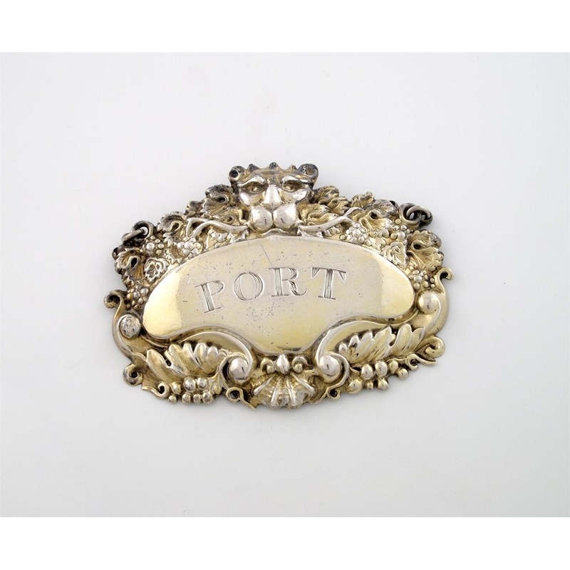 shaped oval form, with a leopard's head mask and trailing grapevines, incised 'PORT', length 6.8cm.