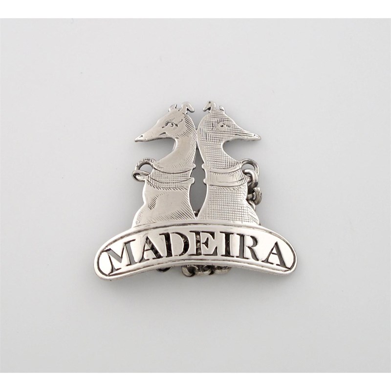 modelled as two demi-greyhounds with collars, oblong banner pierced 'MADEIRA', length 4cm.