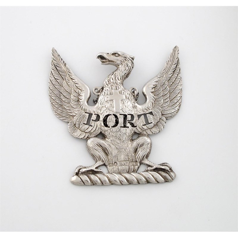 A Victorian silver armorial wine label, by Elkington and Co, Birmingham 1853, modelled as an eagle with spread wings, the breast with a cross, pierced 'PORT', height 6.5cm.