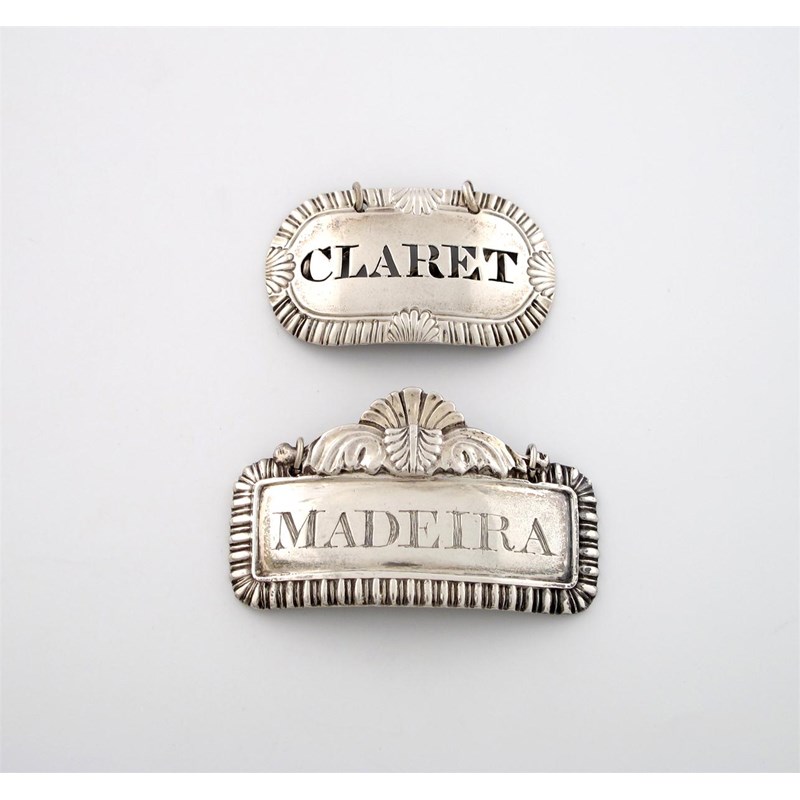rectangular form with a raised foliate and shell pediment, gadroon border, incised 'MADEIRA', length 5.4cm, plus a George III silver wine label, by Thomas and James Phipps, London 1819, pierced 'CLARET', length 4.4cm. (2)