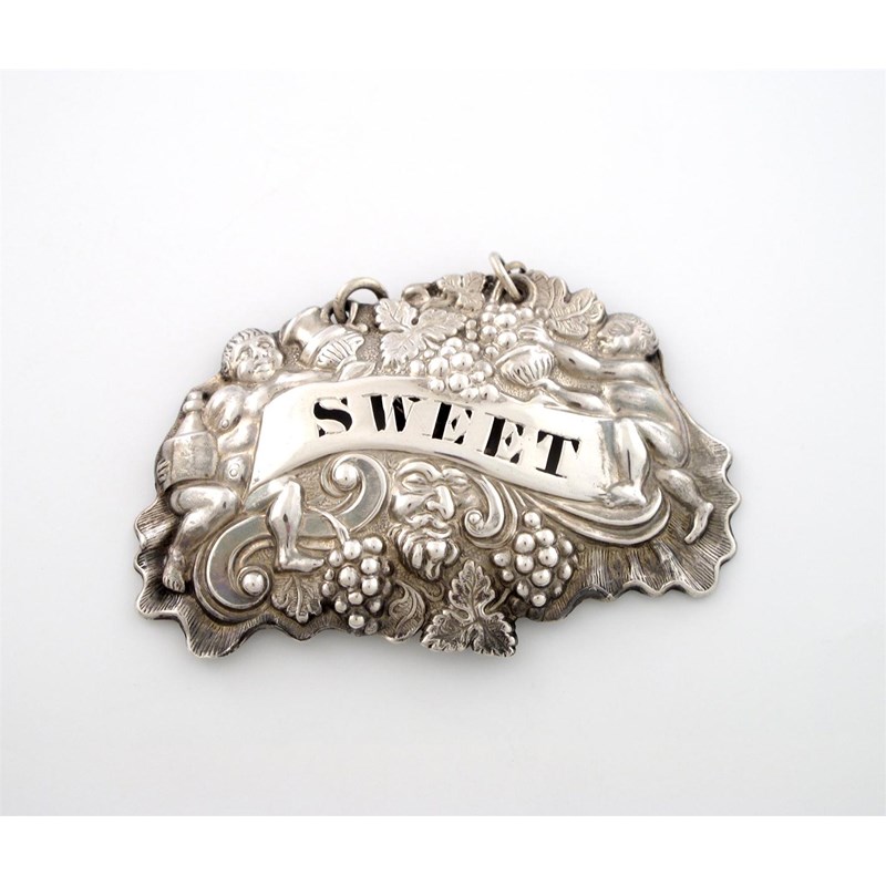 shaped form with Bacchanalian revellers and grape vines, pierced 'SWEET', length 6cm.