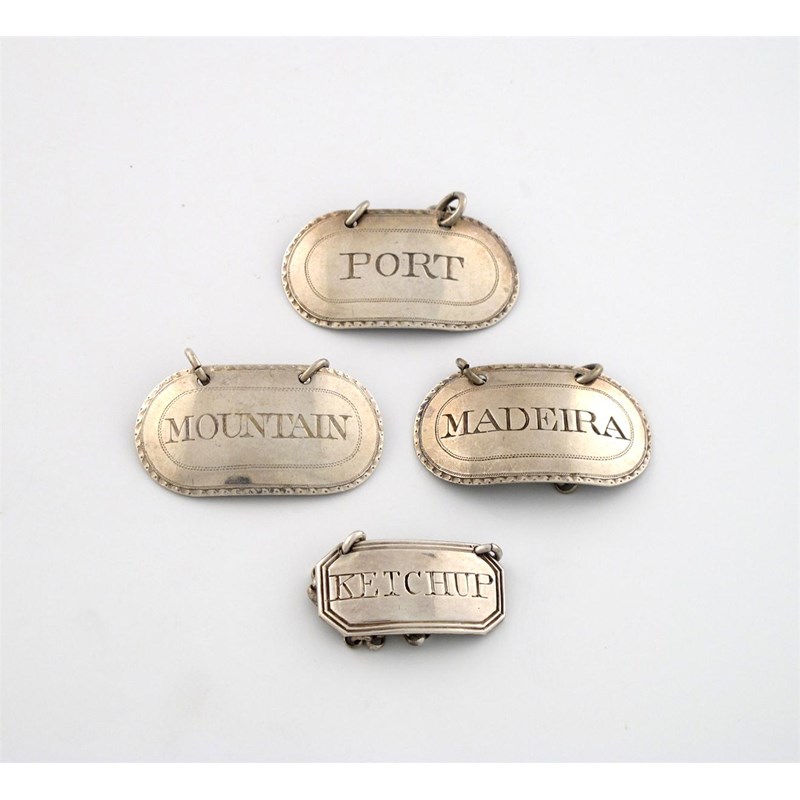 oblong form, bright-cut borders, incised 'MOUNTAIN', 'MADEIRA', and 'PORT', plus an electroplated 'SOY' label. (4)
