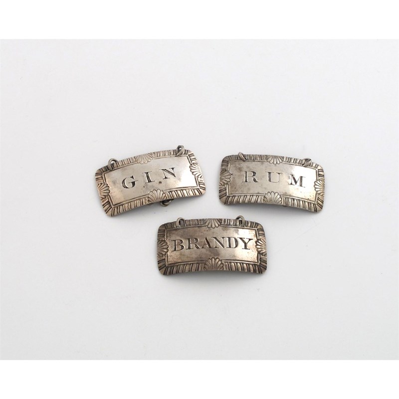 rectangular form, gadroon and shell border, incised 'BRANDY', 'GIN' and 'RUM', length 4.3cm. (3)