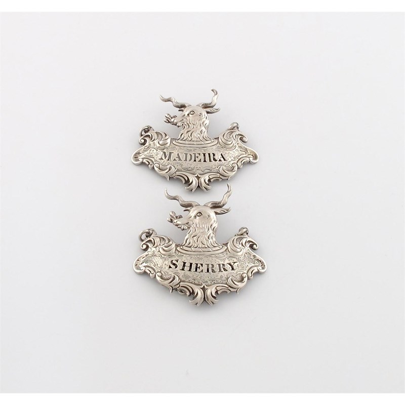 shaped form, foliate scroll borders, with a billy goat pediment, pierced 'SHERRY' and 'MADEIRA', length 6.8cm, approx. weight 1.7oz. (2)
