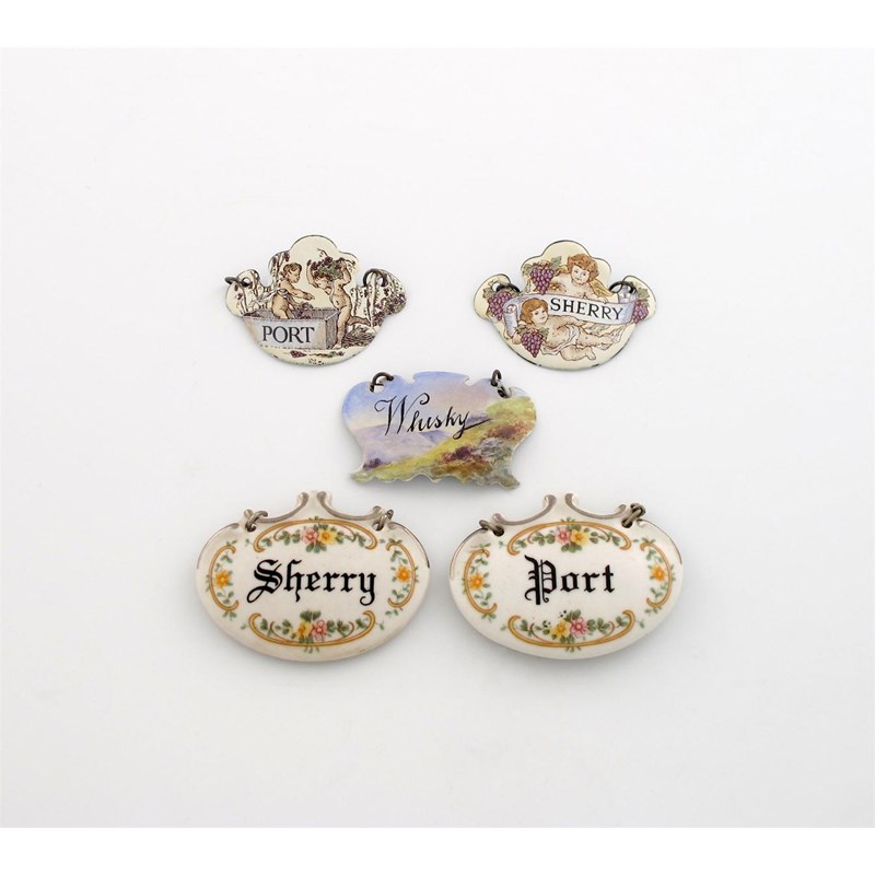 comprising: an enamel one of cartouche form, decorated with a Scottish landscaped scene and titled 'WHISKY', signed to reverse Graham Payne Studios, '83, Worcester, plus two modern enamel labels, 'PORT' and 'SHERRY', and two ceramic labels. (5)