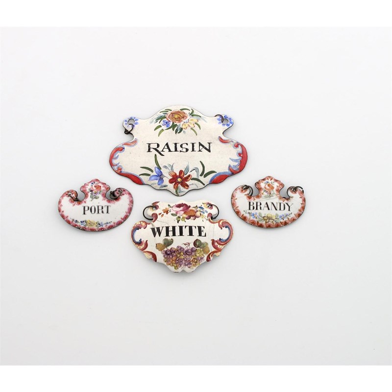comprising: a large French label of cartouche form, decorated with flowers and titled 'RAISIN', plus one of cartouche form titled 'WHITE' and two others 'BRANDY' and 'PORT', length of largest 9.8cm. (4)
