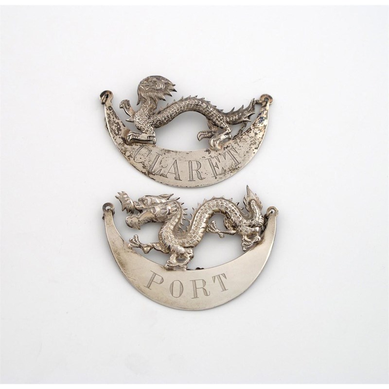 crescent form, mounted with a dragon pediment, incised 'PORT', plus another Chinese silver wine label, by KMS, of similar form, incised 'CLARET', length 6.2cm and 6.1cm. (2)