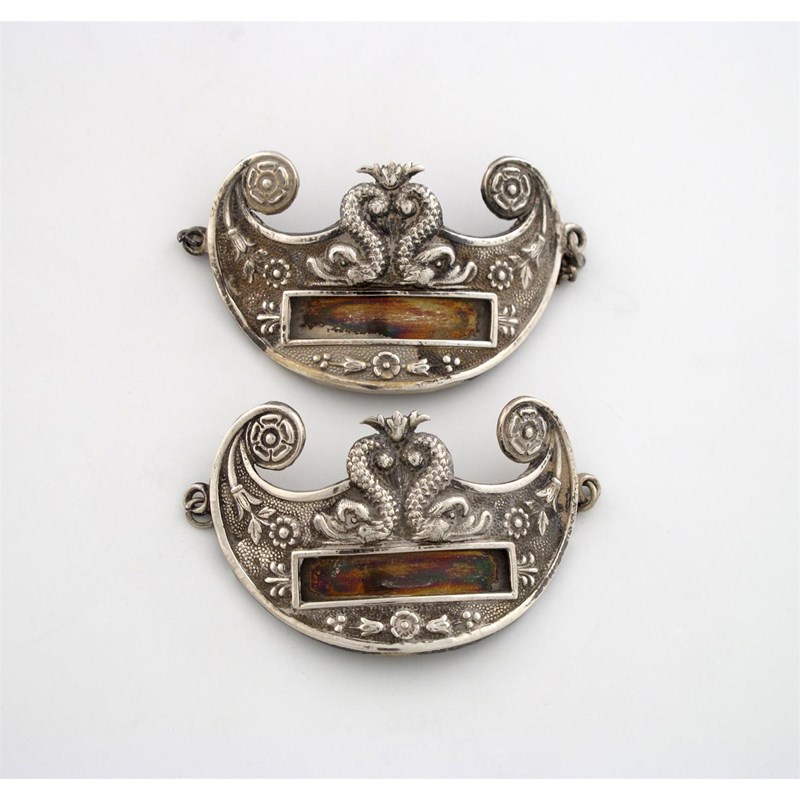 crescent form, with foliate decoration and mythical dolphins on a matted background, length 5cm. (2)