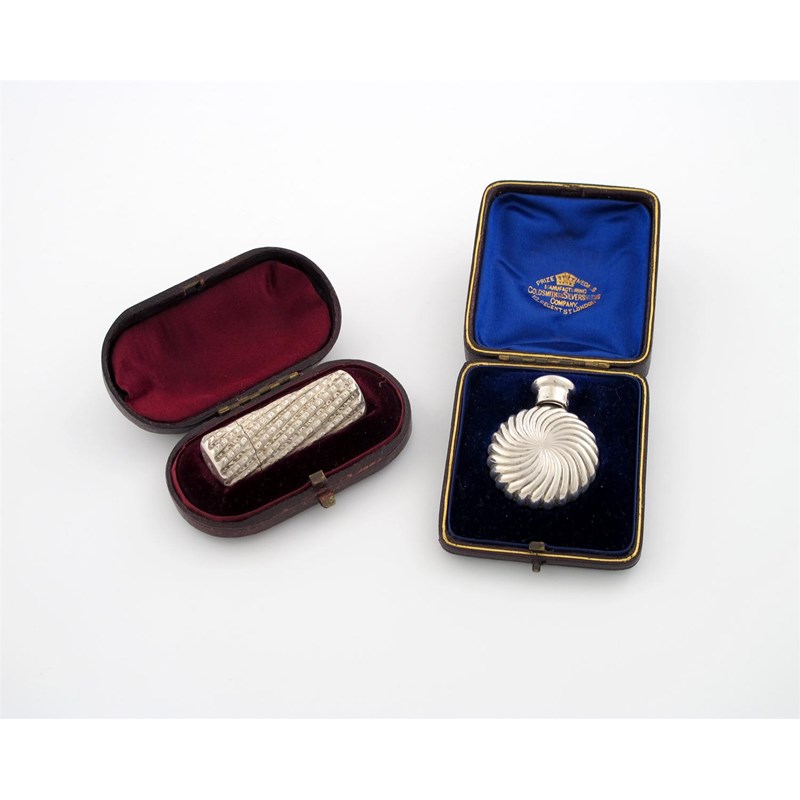 fluted cylindrical form, hinged cover, in a fitted case, height 5cm, plus a Victorian silver scent bottle, by S. Mordan and Co, London 1894, circular fluted form, in a fitted case. (2)