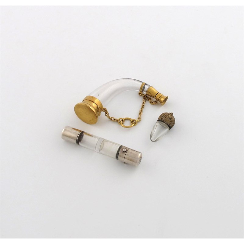 horn form, clear glass body, the hinged cover opens to reveal a vinaigrette with a pierced foliate grille, the screw-off mouth piece, with a chain, length 9cm, plus a small double ended scent bottle, by S. Mordan London 1882 and another scent bottle. (3)