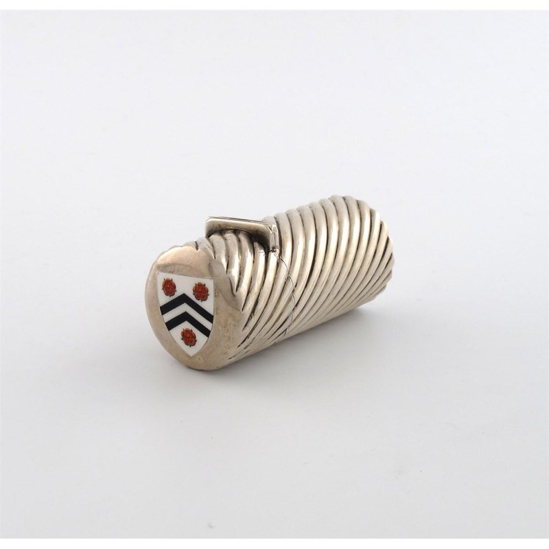 fluted cylindrical form, the hinged cover enamelled with the arms of New College, Oxford, height 7.5cm.