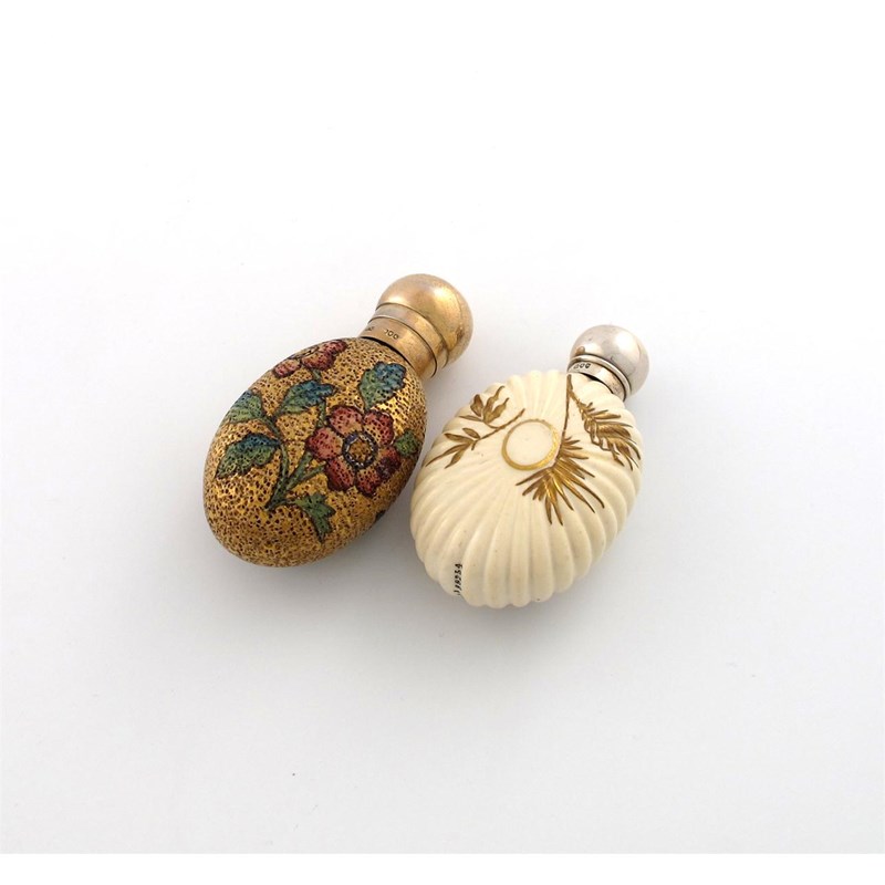 ovoid form, with flowers on a gold ground, screw-off cover, length 9.4cm, plus a Victorian silver mounted ceramic scent bottle, by S. Mordan, London 1887, fluted ovoid form, with gilt flowers on a cream ground, screw-off cover, length 8.7cm. (2)