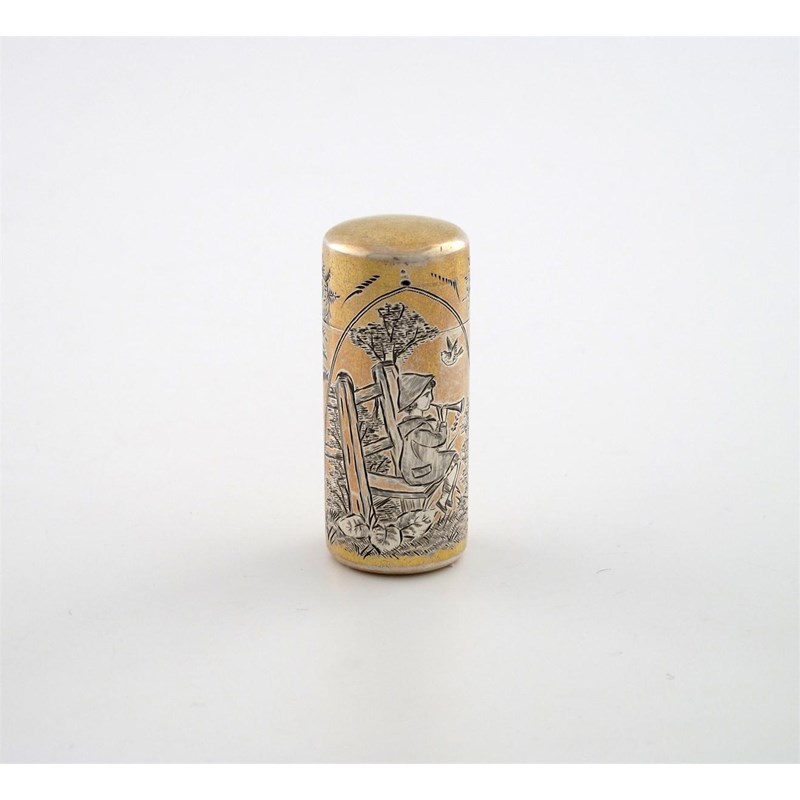 cylindrical form, hinged cover, decorated in the Kate Greenaway manner, engraved with a child blowing a horn in a landscape setting with ferns, height 5.3cm.