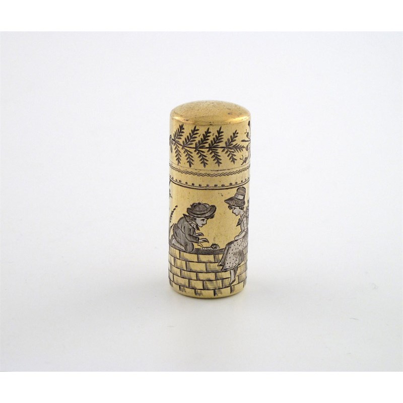 cylindrical form, hinged cover, decorated in the Kate Greenaway manner, engraved with a children sitting on a wall playing with a snail, in a landscape setting with ferns and a house, height 5.3cm.