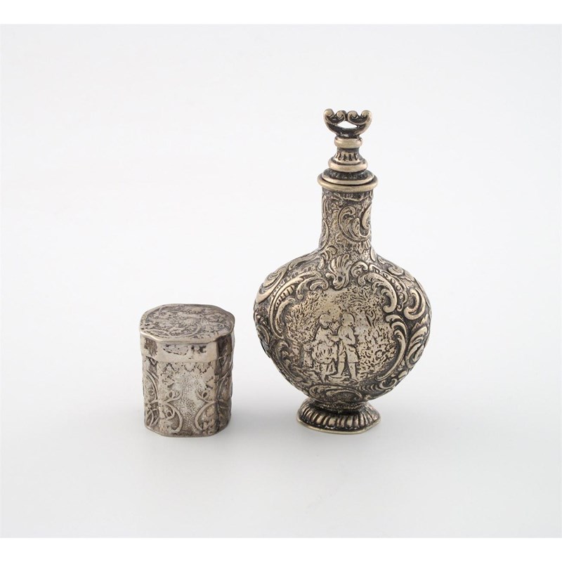 of compressed baluster form, chased with figures in foliate scroll surroundings, screw-off cover, plus a continental silver box of shaped rectangular form, embossed decoration. (2)