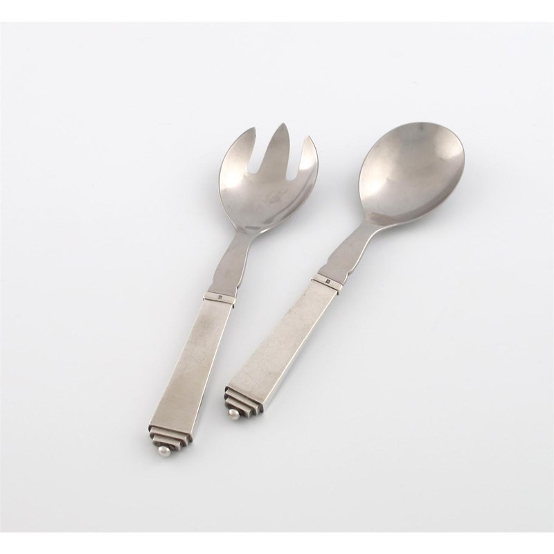 Designed by Harald Nielsen for Georg Jensen, a pair of Danish silver-handled Pyramid pattern salad servers,