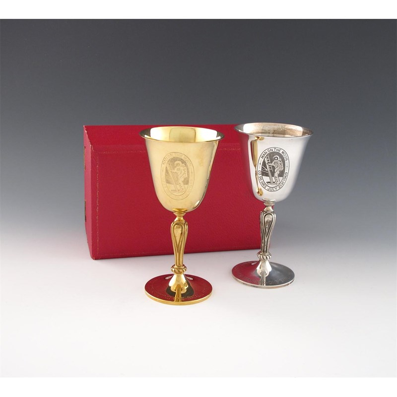tapering circular bowl, engraved with a scene of Neil Armstrong, and inscribed 'MAN ON THE MOON 03.56 HRS JULY 21st 1969,' on a baluster stem on a raised circular foot inscribed 'ONE SMALL STEP FOR MAN-ONE GIANT LEAP FOR MANKIND', height 13.3cm, approx. weight of gold 256.9g (8.1 troy oz), in a fitted case with a certificate, plus a matching silver goblet, approx. weight of silver 4oz.
