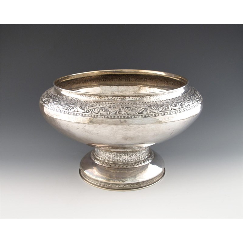 circular tapering form, with chased foliate borders, spot-hammered decoration, on a raised circular foot, diameter 32cm, approx. weight 49oz.