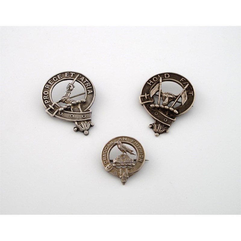 modelled as a bull's head and two flags and with a strap and motto 'HOLD FAST', diameter 3.5cm, plus another silver clan badge, Cameron, same date and maker, modelled as an arm holding a short sword and with a strap and motto 'PRO REGE ET PATRIA', diameter 3.5cm, and another clan badge, Macdonnell, approx. weight 1.2oz. (3)