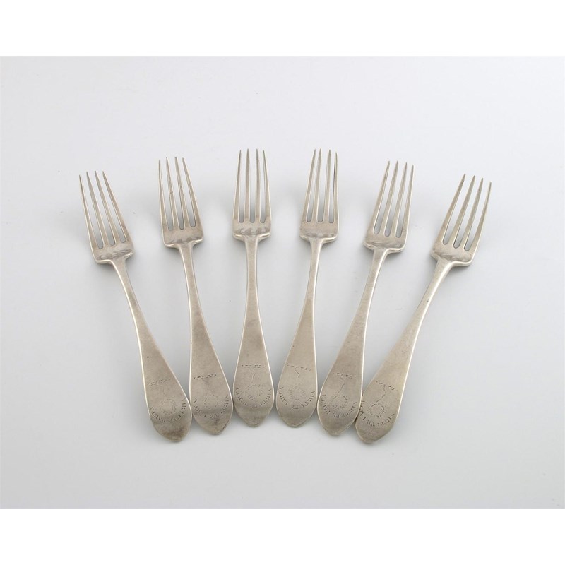 A matched set of six George III Scottish silver Celtic Point pattern table forks
