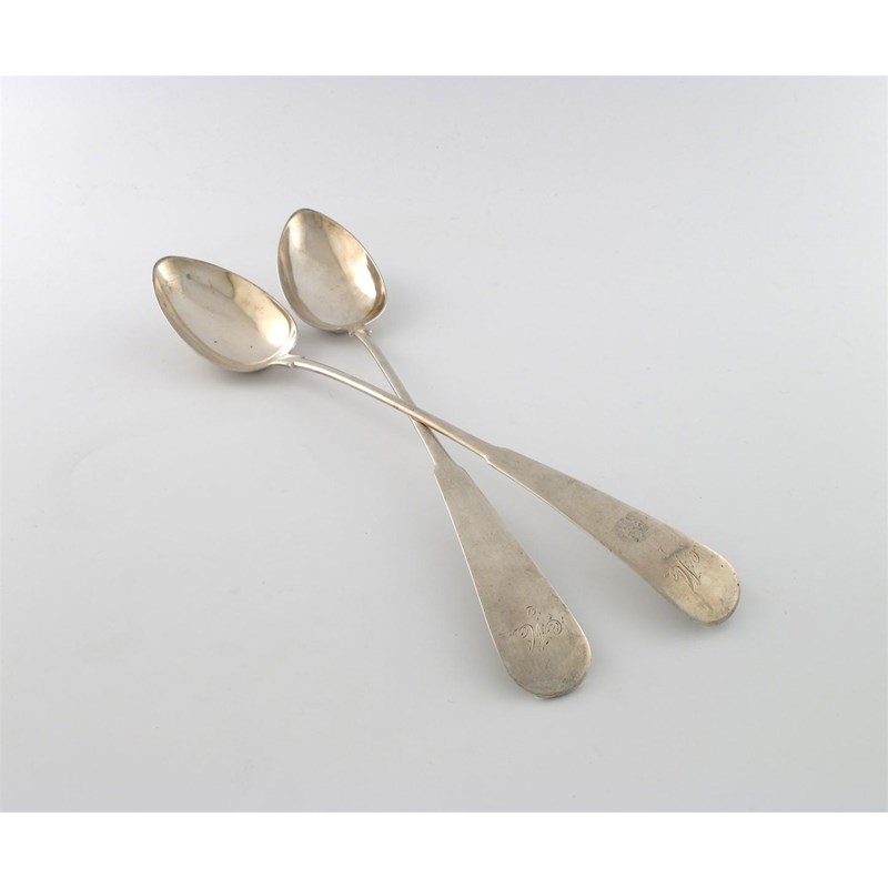 A pair of early 19th century Scottish provincial silver slender Oar pattern basting spoons,