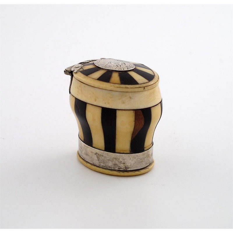 upright waisted form, decorated with alternating strips, the body with a later silver band, the hinged cover set with an oval silver plaque engraved with two shaking hands and initialled 'G.F'. height 5.3cm.