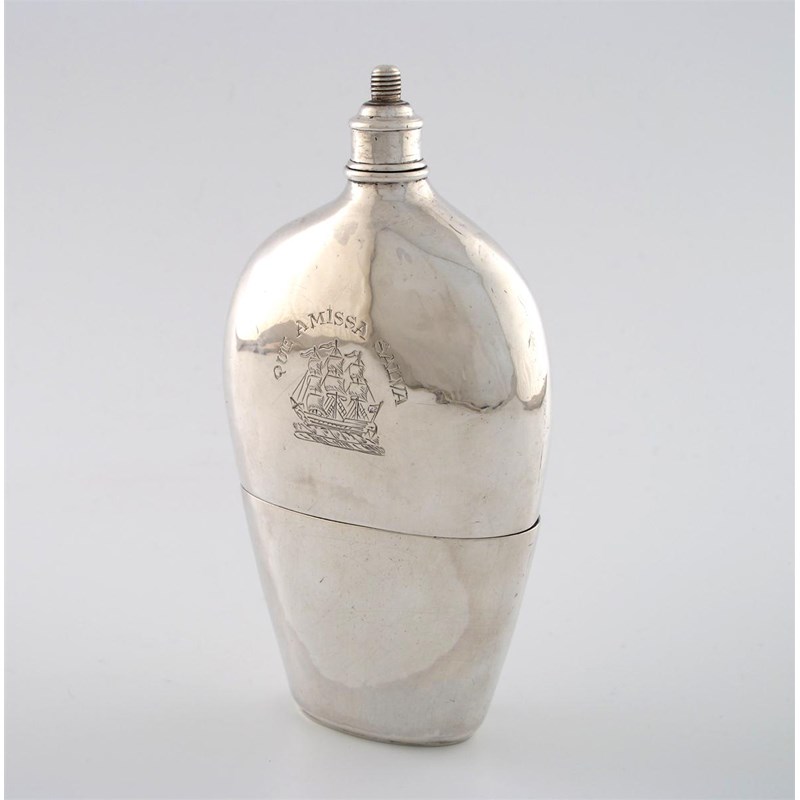 tapering oval form, pull-off drinking cup, screw-off cover, engraved with two crests of a galleon and a motto, length 16.5cm, approx. weight 7oz.