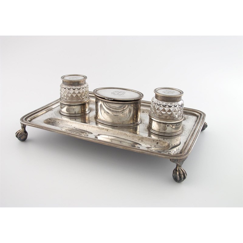 rectangular form, reeded border, with a central oval box with a hinged cover engraved with an anchor, with two pen wells and with two silver mounted cut glass inkwells, with a presentation inscription, on four claw and ball feet, length 30cm, approx. weight 32oz.