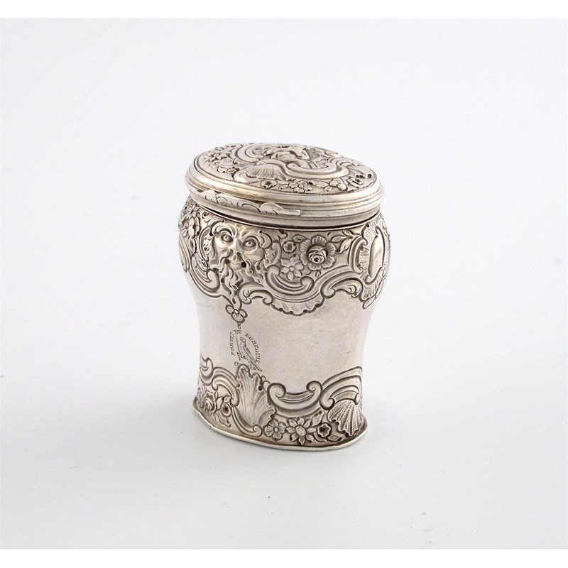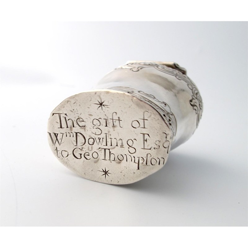 upright waisted form, chased foliate scroll decoration, the hinged cover with a Rococo female figure, the front with a later crest and motto, scratch engraved to base 'The gift of Wm. Dowling Esq. to Geo. Thompson' height 5.3cm.