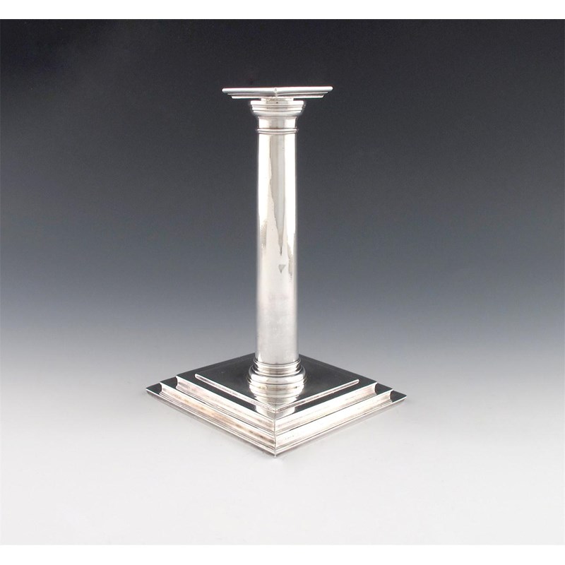 with a plain column and a removable drip pan, on a spread stepped square base, the underside with a scratch weight 27:2, the drip pan with a scratch weight 2:0 1/2', height 21.4cm, approx. weight 28oz.