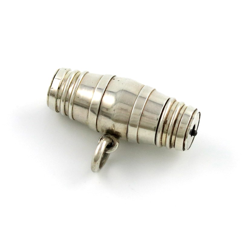 modelled as a hogshead barrel, four stage mechanism, with a ring attachment, length 3.7cm, approx. weight 0.6oz.