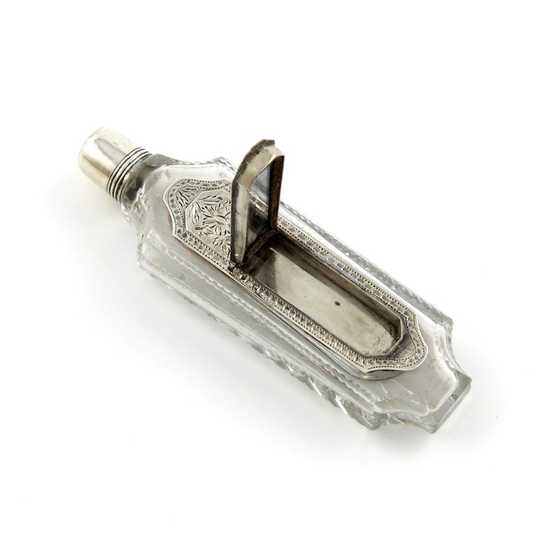 shaped rectangular form, cut-glass body, screw off cover, the body set with a flush-hinged cover and compartment for toothpicks, bright-cut decoration, initialled, length 10.7cm.