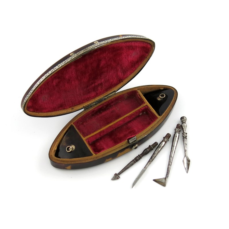oval navette form, the hinged cover with a bright-cut border and oval cartouche, the hinged cover opens to reveal two covered compartments and two open compartments with four steel dental tools, the inside of the cover set with a mirror, velvet lining, length 10.8cm.