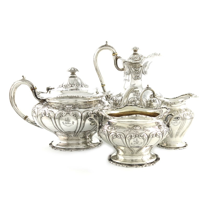 oval bellied form, embossed with roses and foliate scroll decoration, scroll handles with ivory insulators, on oval bases, length handle to spout 28.2cm, approx. weight 63.5oz. (4)