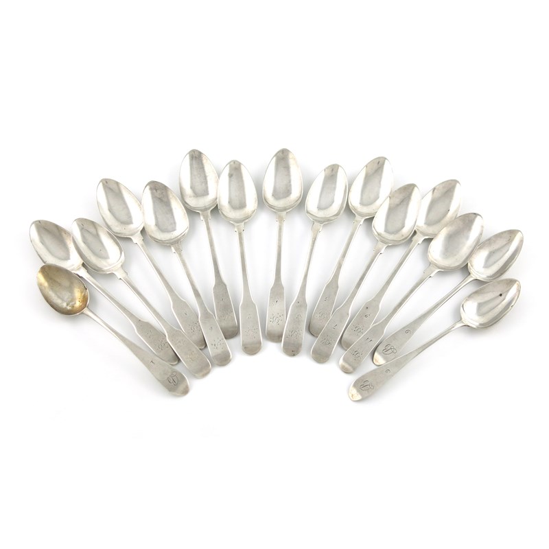 A set of twelve matched George III Scottish provincial and Edwardian silver Fiddle pattern teaspoons