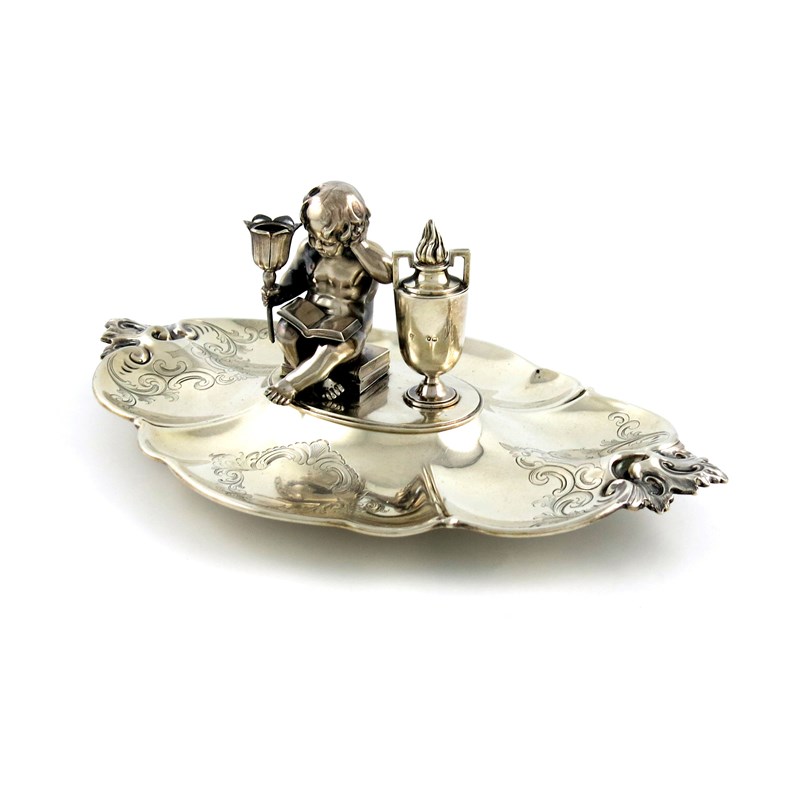shaped oval form, engraved scroll decoration and with foliate scroll handles, the centre with an oval box, the cover mounted with a seated cherub reading a book and holding a foliate taper stick capital, the inkwell modelled as a two-handled urn with a pull-out flame finial, length 29.8cm, approx. weight 21.3oz.