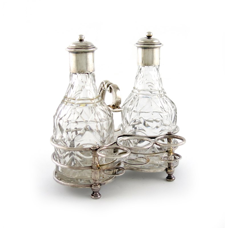 A Queen Anne silver two bottle oil and vinegar stand