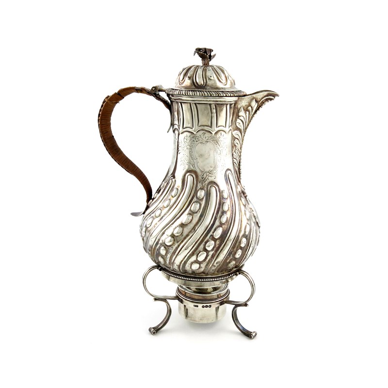 A George III silver hot water / coffee jug on a later George IV stand with a burner