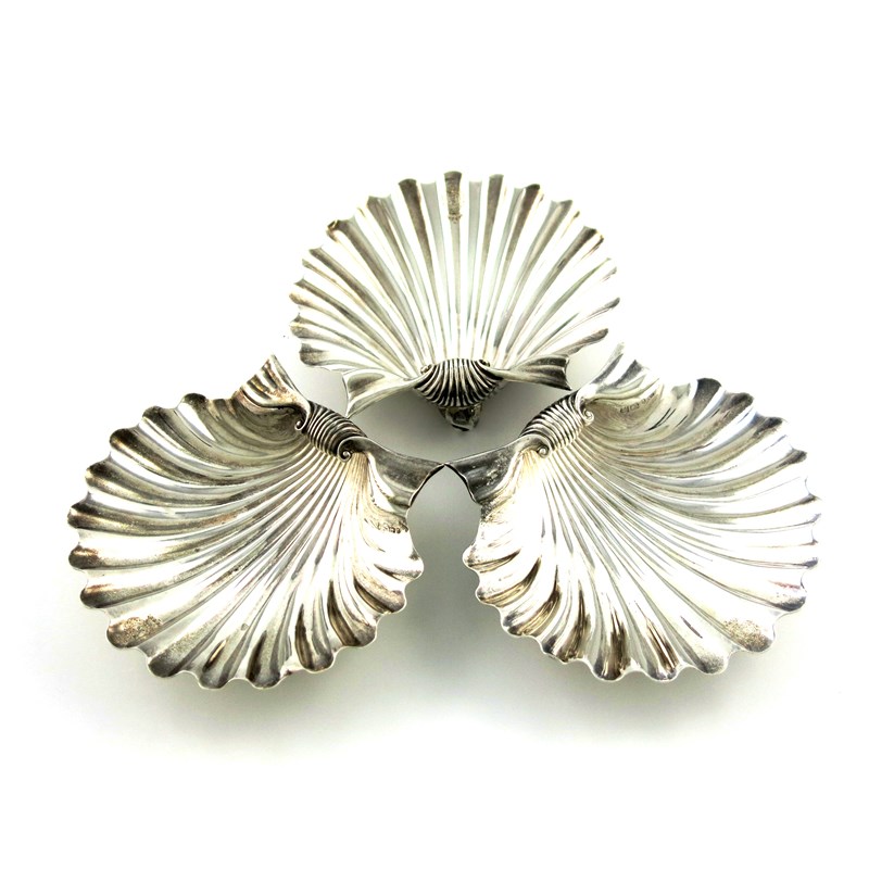 shell form, engraved with a crest, on three scroll shell feet, length 13cm, approx. weight 13oz. (3)
